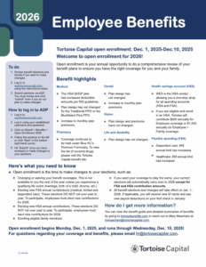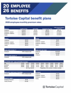 Your 2026 Benefits Guide is your go-to resource. It highlights what’s available, what’s new, and how to make confident, informed choices. You will also find additional benefit information on the Tortoise Capital benefit site.